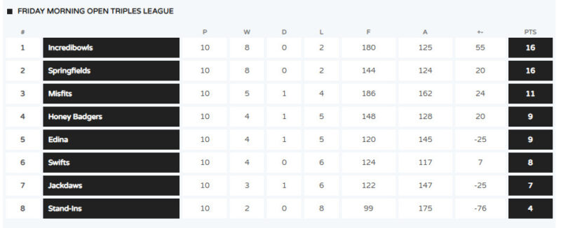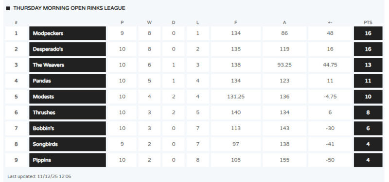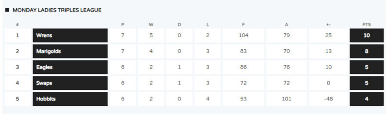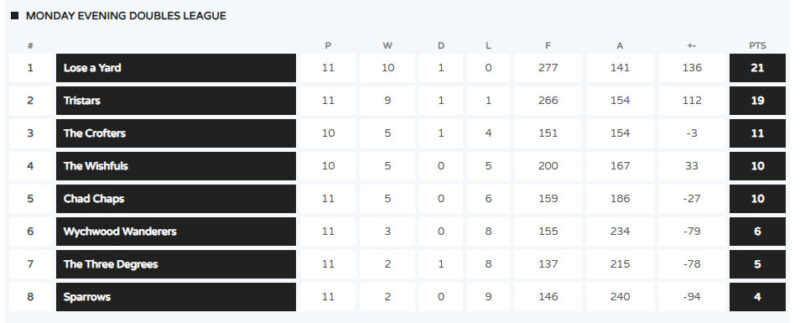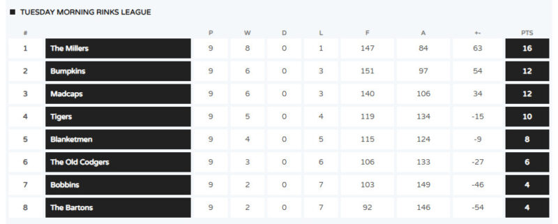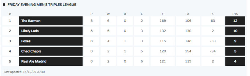 Current League Tables Positions as of Monday 15th December